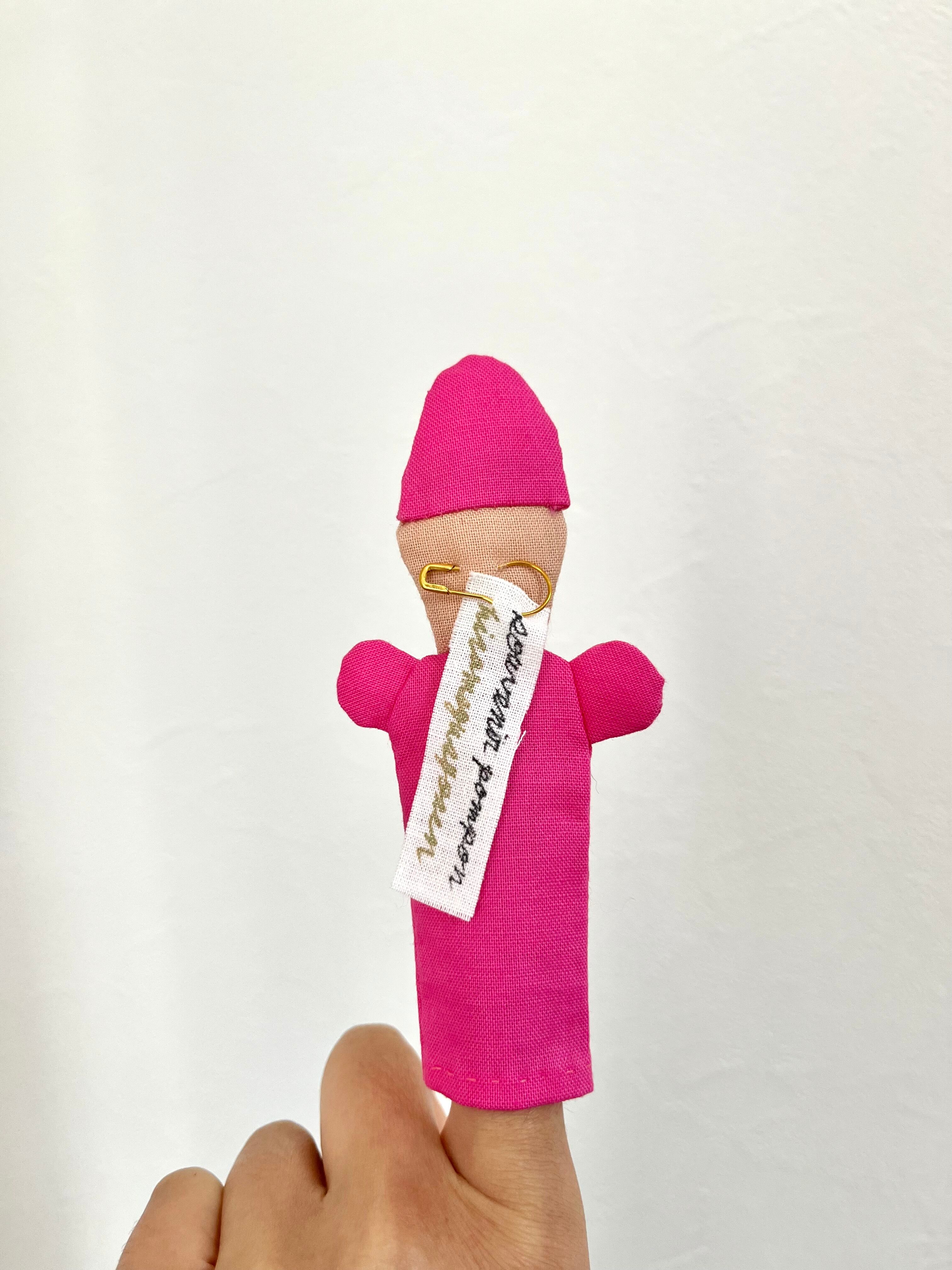 なるべく役に立たなくて、つい集めたくなるものを作っていきたいなと思った時に、いくつか所持しているペルーの指人形を思いました。編み物はまったくダメなので布ならと作ってみたところ、まさに理想とする仕上がりに。ブローチにするには少々心もとないピンですが、タグ付け用につけているピンで服やかばん、カーテンなどにつけてみたり、ペン立てに立ってるペンに差してみたり、日々がちょっぴり愉快になるといいです。
