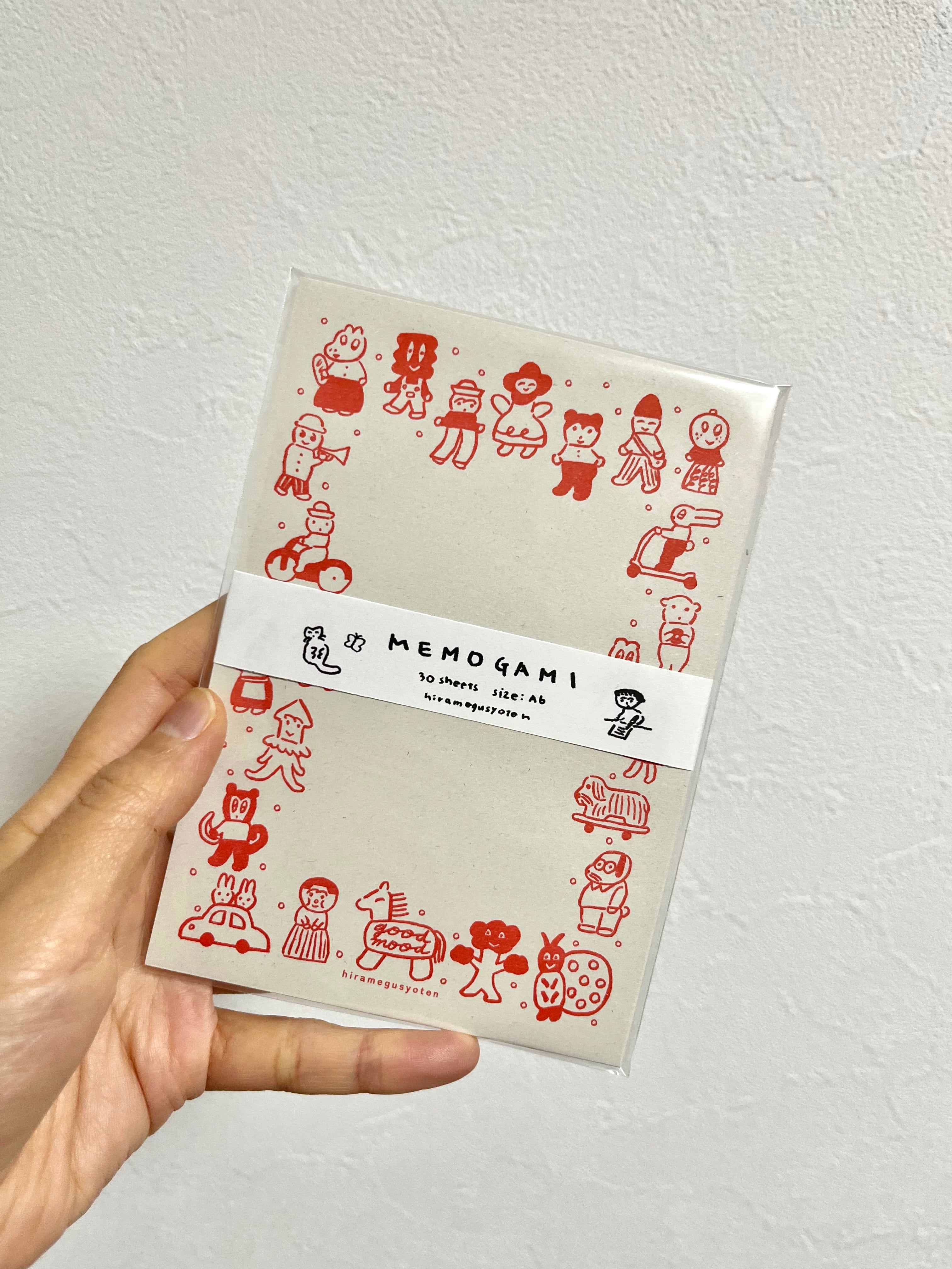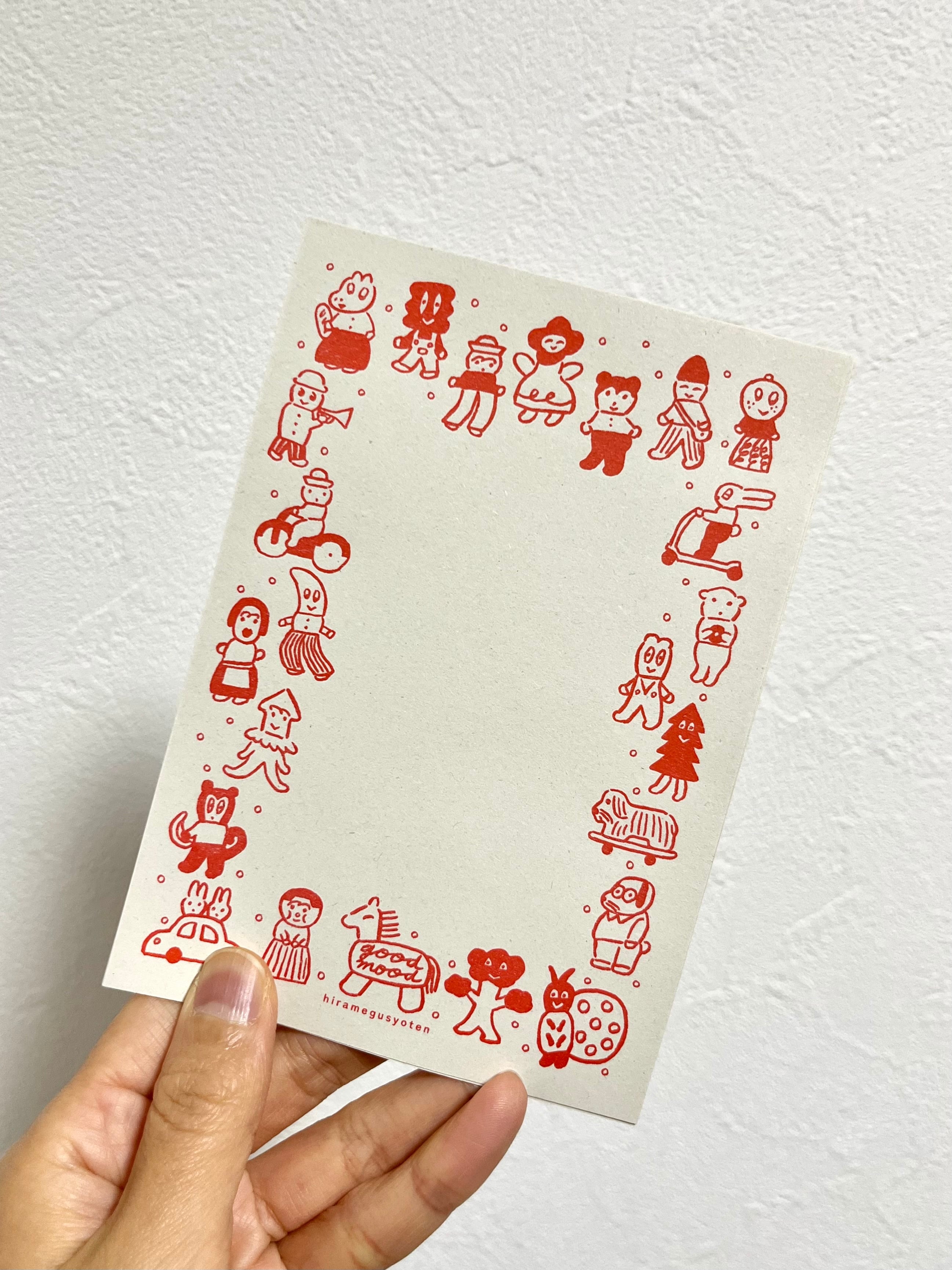 個展「だんだんよくなる」で作成した”ごきげんすたんぷ”の柄でメモ紙をつくりました。リソグラフ印刷を使用しており、特有の風合いがあります。メモ帳にはなっていないのですが、しっかり30枚入っているので気兼ねなく、オールシーズンお使いいただけます。